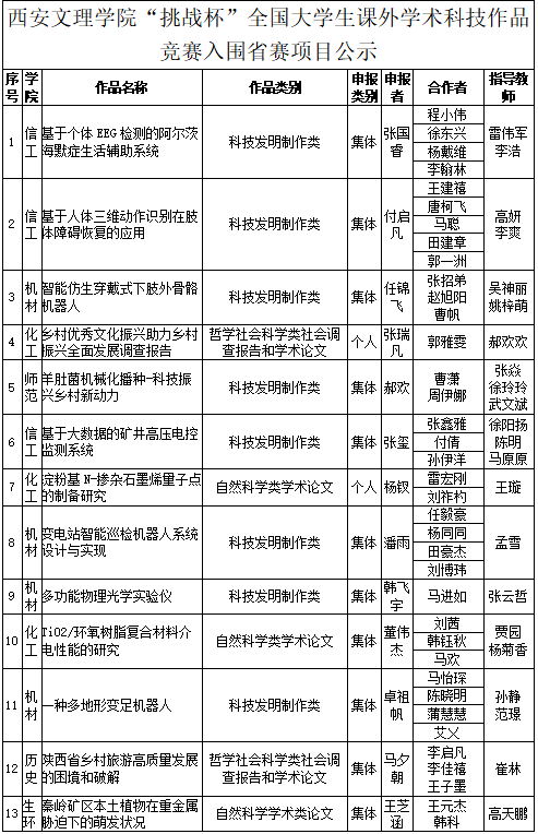 kok网页版“挑战杯”全国大学生课外学术科技作品竞赛入围省赛项目公示